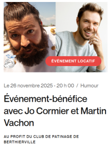 Le Club de Patinage Artistique de Berthierville, en collaboration avec Services Hydrauliques Lanaudière, est fier de vous présenter une soirée d’humour en compagnie de Jo Cormier et Martin Vachon le 26 novembre prochain à 20h, au Centre Culturel Desjardins à Joliette. Les profits iront au CPA Berthierville et à ses patineurs